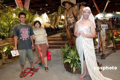 | 八月七日,在臺(tái)北世貿(mào)中心進(jìn)行的二零零五年臺(tái)北“中華美食節(jié)”進(jìn)入最后一天,眾多臺(tái)北市民抓住最后一天的時(shí)間,到美食節(jié)參觀、品嘗美食。圖為一個(gè)參展商采用另類(lèi)的“美人魚(yú)”宣傳海鮮美食。作者:盛佳鵬
