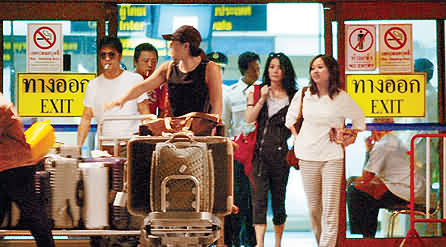 現(xiàn)場(chǎng)所見(jiàn),王菲邊走邊把墨鏡移到頭上,神情疲累,一步出機(jī)場(chǎng)大門(mén)已急不及待煲煙提神,至于表情輕松的李亞鵬則全程戴上太陽(yáng)眼鏡,同樣點(diǎn)起香煙抽起來(lái),然后二人便站在街上等候尾隨友人推出行李車(chē),其間王菲難掩倦意,頻頻打呵欠。眾人其后登上早已在場(chǎng)等候的車(chē)子,行李則存放在另一小型貨車(chē)上,一切打點(diǎn)妥當(dāng)后,司機(jī)便駕車(chē)直駛Banyan Tree五星級(jí)酒店。