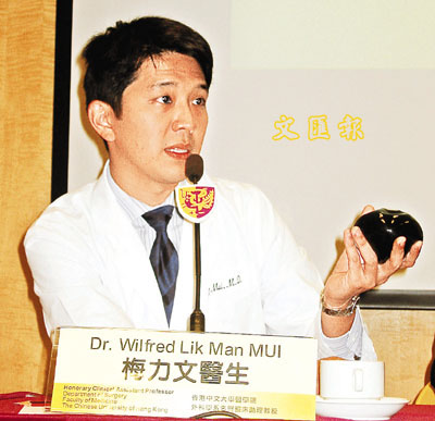 外科學系名譽臨床助理教授梅力文介紹說,胃球可注入500立方厘米的鹽水,最大直徑達15厘米。手術(shù)只花30分鐘,水球可放于胃內(nèi)6個月,并可還原或重置水球,副作用極少。