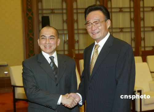 八月十二日,中國(guó)全國(guó)人大常委會(huì)委員長(zhǎng)吳邦國(guó)在北京人民大會(huì)堂會(huì)見(jiàn)來(lái)訪的柬埔寨國(guó)王西哈莫尼。作者:史利