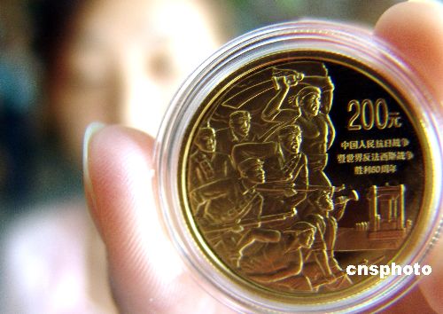 中新社北京八月十三日電(記者李鵬)中國央行定于八月十五日發(fā)行中國人民抗日戰(zhàn)爭暨世界反法西斯戰(zhàn)爭勝利六十周年金銀紀(jì)念幣一套。該套紀(jì)念幣共兩枚,其中金銀幣各一枚,均為中華人民共和國法定貨幣。