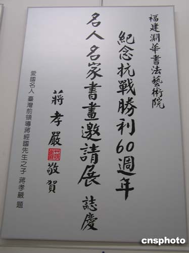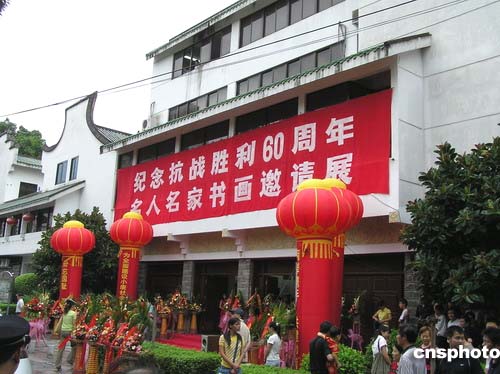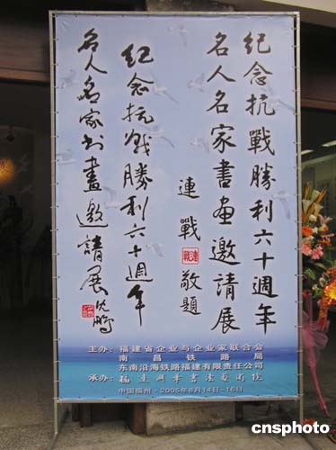 中新網(wǎng)8月14日電 為紀念抗戰(zhàn)勝利60周年,弘揚中華兒女愛國主義和革命英雄主義精神,推動祖國和平統(tǒng)一大業(yè),由中國新聞社福建分社、中國華藝廣播公司和福建淵華書法藝術(shù)院等單位發(fā)起,福建省企業(yè)與企業(yè)家聯(lián)合會、南昌鐵路局、東南沿海鐵路福建有限責(zé)任公司聯(lián)合主辦的《紀念抗戰(zhàn)勝利60周年名人名家書畫邀請展》今天上午在福州畫院隆重開展。