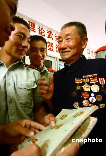 | 為紀(jì)念“8·15”抗戰(zhàn)勝利60周年,武警江蘇總隊所屬各部隊紛紛開展形式多樣的紀(jì)念活動。8月14日,江蘇泰州市支隊邀請江堰市溱潼鎮(zhèn)湖北口村戰(zhàn)功卓著的老英雄田春富來隊做報告,聽老人家娓娓訴說當(dāng)年戰(zhàn)場經(jīng)歷,戰(zhàn)士們被深深地吸引住了!作者:唐占軍