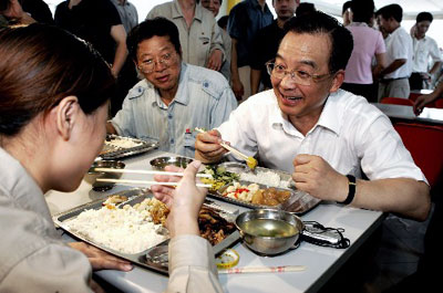 溫家寶端著一盤(pán)南瓜、白菜和米飯走到工人們中間,和工人李晨燕、湯世強(qiáng)、朱振軒坐在一起。