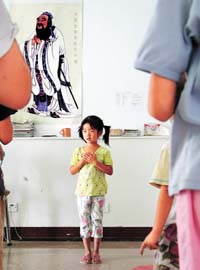 劉彩虹站在“大成至圣先師孔子像”前,帶著全班同學(xué)背誦《弟子規(guī)》。彩虹是這個(gè)班年齡最大的孩子,所以常常帶著大家朗讀課文。班里二十幾個(gè)學(xué)生,3歲到11歲不等,大都來自瓦窯村,也有幾個(gè)孩子是從城里來的。家長反映,20多天下來,孩子有了些變化,對(duì)長輩恭敬了,知道給父母夾菜,飯后主動(dòng)幫著洗碗。