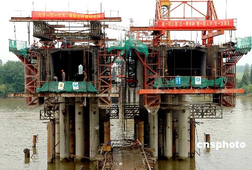 8月17日,江蘇揚州京杭運河大橋建設開始進入上部箱梁澆鑄。該大橋是正在建設中的南京至南通公路上的重點工程,全長697米,經(jīng)過15個月的建設,大橋下部結(jié)構(gòu)已全面完工,上部箱梁澆鑄現(xiàn)以每周4米的速度向兩邊擴展,預計大橋?qū)⒃?1月底合攏。作者:張丙濤