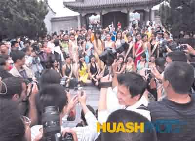 在現(xiàn)場,攝影記者們更是排成行,一時間,參賽佳麗們被圍得水泄不通。佳麗們的美麗也吸引了不少老外的注意,他們舉著相機,一邊喊“here”,一邊高興地拍照,等佳麗們面向他們時,他們還趕忙舉起V形手勢表示歡迎。