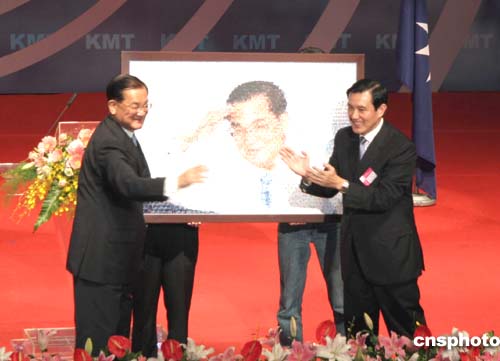 馬英九致詞后,代表全體黨員送一份特別的禮物給連戰(zhàn)。這份禮物據(jù)說是參考好萊塢明星金凱利主演的“楚門的世界”電影海報的構想,將連戰(zhàn)拍過的照片,一張張的拼成巨幅的大頭照。