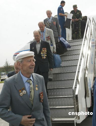 被邀請觀摩“和平使命—2005”中俄聯(lián)合軍事演習(xí)的俄羅斯十名蘇聯(lián)二戰(zhàn)時(shí)期老戰(zhàn)士,八月十九日踏上中國的土地。作者:王麗南
