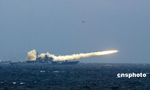 “和平使命-2005”中俄聯(lián)合軍事演習(xí)第三階段8月23日在中國(guó)山東半島及其附近海域舉行。圖為俄羅斯驅(qū)逐艦發(fā)射先進(jìn)的反艦導(dǎo)彈。作者:王麗南