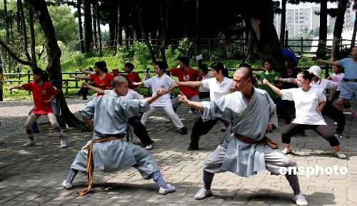 八月二十四日,河南嵩山少林寺武僧團在臺灣開展武術(shù)交流活動時與臺北武術(shù)愛好者同場習(xí)武。圖為十歲的孫家閎(右)和少林寺延路法師(左)一起演習(xí)少林通臂拳。作者:趙海燕