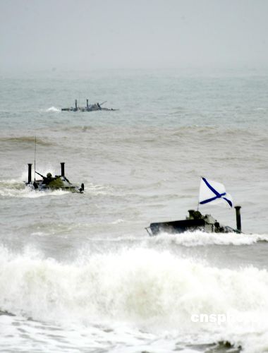 十一時三十八分,在十二架武裝直升機(jī)掩護(hù)下,俄方一個海軍陸戰(zhàn)連、十輛裝甲輸送車和中方一個兩棲裝甲營、三十三輛裝甲戰(zhàn)車搶灘登陸。十一時四十分,第一波登陸兵順利搶灘上陸,奪占“敵”灘頭陣地。十一時五十二分,聯(lián)合部隊三艘登陸艦抵灘,搭載裝甲步兵營的三十二輛步戰(zhàn)車涉水上陸,作為二梯隊遂行奪占鞏固登陸場行動。