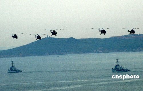 八月二十四日,“和平使命—2005”中俄聯(lián)合軍事演習(xí)第三階段兩棲登陸作戰(zhàn)實(shí)兵演練在山東半島展開。圖為直升機(jī)呈梯級(jí)在艦艇上空盤旋掩護(hù)艦艇向岸防挺進(jìn)。作者:王麗南
