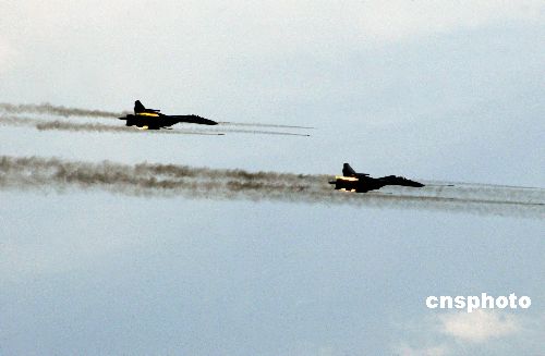 | 八月二十四日,“和平使命—2005”中俄聯(lián)合軍事演習(xí)第三階段兩棲登陸作戰(zhàn)實兵演練在山東半島展開。圖為參加兩棲登陸作戰(zhàn)實兵演練的中國空軍殲擊機(jī)雙機(jī)同時發(fā)射火箭彈攻擊地面目標(biāo)。作者:王麗南