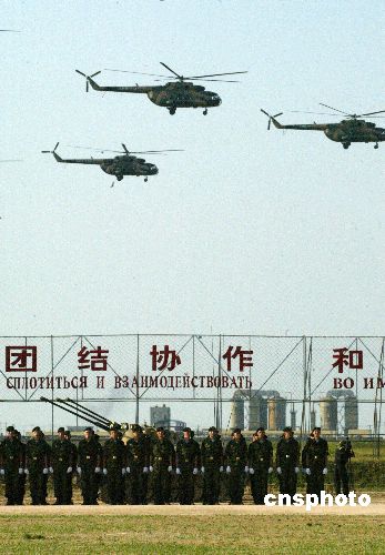 “和平使命-2005”中俄聯(lián)合軍事演習(xí)8月25日下午在山東濰北地區(qū)結(jié)束。在當(dāng)日舉行的閱兵式上,中方直升機(jī)編隊在演習(xí)結(jié)束后接受檢閱。作者:王麗南
