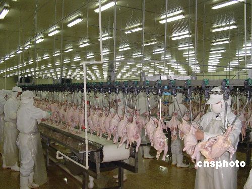 | 十一月十九日,閩北光澤縣圣農(nóng)集團(tuán)有限公司的員工在屠宰車間消毒,防堵禽流感。圣農(nóng)集團(tuán)有限公司是中國內(nèi)地現(xiàn)代化程度最高的集種雞飼養(yǎng)、苗雞孵化、肉雞飼養(yǎng)、屠宰加工、食品深加工為一體的聯(lián)合型白羽肉雞生產(chǎn)食品加工企業(yè),為保證雞肉食品的安全,該公司采取了一系列嚴(yán)格消毒措施。作者:陳國明