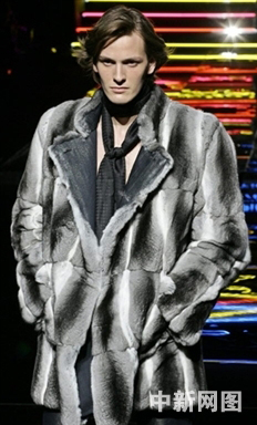 1月17日,在意大利米蘭舉行的2006/07秋冬男裝發(fā)布會上,一名模特在展示意大利設(shè)計師Carlo Pignatelli的作品。