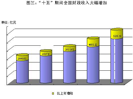 2005年是“十五”計(jì)劃的最后一年;仡欉^(guò)去的五年,國(guó)家財(cái)政面貌發(fā)生了新的變化,主要是:國(guó)家財(cái)政實(shí)力不斷壯大。全國(guó)財(cái)政收入連續(xù)突破2萬(wàn)億元、2.5萬(wàn)億元和3萬(wàn)億元大關(guān)!笆濉睍r(shí)期全國(guó)財(cái)政收入為11.5萬(wàn)億元,比“九五”時(shí)期增加6.4萬(wàn)億元,增長(zhǎng)126.5%,其中中央財(cái)政本級(jí)收入增長(zhǎng)141.5%,地方財(cái)政本級(jí)收入增長(zhǎng)111.3%。“十五”末2005年全國(guó)財(cái)政收入占GDP比重為17.3%,比“九五”末2000年的13.5%上升了3.8個(gè)百分點(diǎn)。全國(guó)財(cái)政支出為12.8萬(wàn)億元,比“九五”時(shí)期增加7.1萬(wàn)億元,增長(zhǎng)124%,其中中央財(cái)政本級(jí)支出增長(zhǎng)109.5%,地方財(cái)政本級(jí)支出增長(zhǎng)130.5%。財(cái)政收入增長(zhǎng)的穩(wěn)定性和協(xié)調(diào)性進(jìn)一步增強(qiáng),財(cái)政發(fā)展的步伐不斷加快。財(cái)政宏觀調(diào)控作用不斷增強(qiáng)。根據(jù)經(jīng)濟(jì)發(fā)展的客觀需要,相機(jī)調(diào)整并順利實(shí)現(xiàn)了積極財(cái)政政策向穩(wěn)健財(cái)政政策的轉(zhuǎn)變,促進(jìn)了經(jīng)濟(jì)保持平穩(wěn)較快發(fā)展。在認(rèn)真總結(jié)財(cái)政政策實(shí)踐的基礎(chǔ)上,建立健全了基本適應(yīng)通貨膨脹、通貨緊縮、供求總量基本平衡但結(jié)構(gòu)不均衡等不同經(jīng)濟(jì)運(yùn)行形態(tài)需要的,包括目標(biāo)定位、政策組合、時(shí)機(jī)選擇、組織實(shí)施等一系列要素在內(nèi)的財(cái)政宏觀調(diào)控體系。以人為本的公共支出體系不斷完善。按照科學(xué)發(fā)展觀和社會(huì)主義市場(chǎng)經(jīng)濟(jì)發(fā)展的要求,大力調(diào)整和優(yōu)化支出結(jié)構(gòu),不斷減少并逐步退出對(duì)一般競(jìng)爭(zhēng)性、經(jīng)營(yíng)性領(lǐng)域的財(cái)政投入;大力支持義務(wù)教育、就業(yè)和社會(huì)保障、公共衛(wèi)生等公益性社會(huì)事業(yè)的改革和發(fā)展;向困難地區(qū)、行業(yè)和群眾傾斜,注意解決事關(guān)人民群眾切身利益的突出矛盾和問(wèn)題,把實(shí)現(xiàn)好、維護(hù)好、發(fā)展好最廣大人民群眾的根本利益作為財(cái)政支出的出發(fā)點(diǎn)和落腳點(diǎn)。公共財(cái)政管理體制改革不斷深化。積極推進(jìn)出口退稅機(jī)制改革、增值稅轉(zhuǎn)型、個(gè)人所得稅及所得稅收入分享改革,深化預(yù)算管理制度改革,支持其他方面經(jīng)濟(jì)體制改革;推動(dòng)財(cái)政法制建設(shè)、加強(qiáng)會(huì)計(jì)基礎(chǔ)工作、轉(zhuǎn)變財(cái)政監(jiān)督方式,進(jìn)一步健全了公共財(cái)政管理框架。