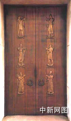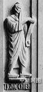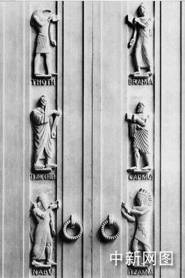 倉頡(TS'ANG CHIE)的雕像是在東側(cè)大銅門上(左扇門第二個)。國會圖書館對倉頡的概括是“中國文學(xué)的庇護(hù)神”(the Chinese patron of writing)。顯然,這種評價比我們傳統(tǒng)上所認(rèn)為的倉頡是造字圣人更高了一步。與倉頡雕像放在一起的還有透特(埃及神話中的月神)、納布(美索不達(dá)米亞阿卡德人的神)、梵天(印度教三大神之一創(chuàng)造之神)、 腓尼基王子卡德摩斯(希臘神話中能夠“播種龍牙”的神) 以及古代波斯人的英雄塔赫穆拉斯。