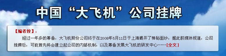 | 中共中央政治局常委、國(guó)務(wù)院總理溫家寶2007年12月29日到30日專程赴陜西西安。在西飛集團(tuán)公司,溫家寶說,中國(guó)人要用自己的雙手和智慧制造出在世界上有競(jìng)爭(zhēng)力的大飛機(jī)。他并鼓勵(lì)大家說,你們肩上擔(dān)子很重,要下決心把大飛機(jī)搞上去……<詳細(xì)> |
