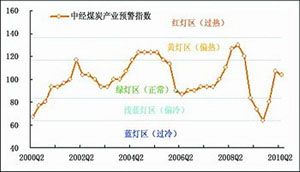 預(yù)警:2010年二季度,中經(jīng)煤炭產(chǎn)業(yè)預(yù)警指數(shù)為103.3點(diǎn),比上季度下降3.4點(diǎn),在“綠燈區(qū)”內(nèi)小幅回落。這主要因?yàn)楫a(chǎn)品銷(xiāo)售收入同比增速出現(xiàn)逆轉(zhuǎn),產(chǎn)量有所下降等。