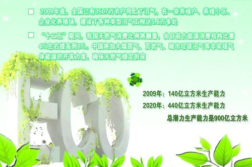 據(jù)悉,在進(jìn)入21世紀(jì)的10年間,我國(guó)政府對(duì)生物天然氣的投入高達(dá)240億元人民幣。2009年年底,全國(guó)已有3507萬農(nóng)戶用上了沼氣,在一些養(yǎng)殖戶、養(yǎng)殖小區(qū)、企業(yè)化養(yǎng)殖場(chǎng),建設(shè)了各種類型沼氣工程達(dá)5.6萬多處,形成了每年140億立方米生產(chǎn)能力。中國(guó)已成為世界上沼氣發(fā)展速度最快、建設(shè)規(guī)模最大和涉及人群最多的國(guó)家。