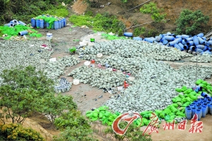 近日,有熱心讀者致電廣州日?qǐng)?bào)稱一個(gè)地下金屬回收廠藏身于布吉南灣一處山坳里,留意觀察才發(fā)現(xiàn)里面的人用明火和強(qiáng)酸提煉各種金屬,近百桶裝滿各種腐蝕性、強(qiáng)酸性的化學(xué)品就堆放在一個(gè)雨棚下面,對(duì)周邊環(huán)境危害很大。1月25日上午,記者驅(qū)車從吉廈工業(yè)園內(nèi)經(jīng)過(guò)一段崎嶇不平的山路,才在一處山坳里找到這處極其隱蔽的地下金屬回收廠。
