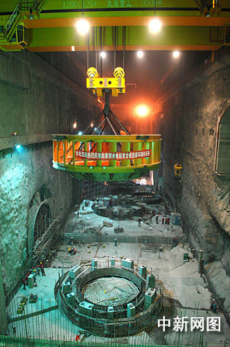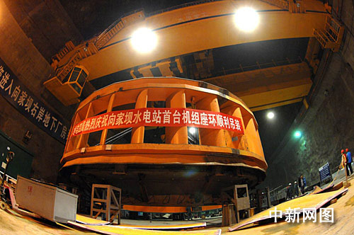 3月23日上午10點40分,在向家壩水電站右岸的地下隧道內(nèi),施工人員用8組鋼纜將重量達362噸、直徑達14.38米的座環(huán)固定在1200噸的橋機上。橋機緩緩將座環(huán)提升到距離地面2米的高度,慢慢平移近100米,到地下廠房基坑1號機組基座上方。座環(huán)平穩(wěn)地放在了1號機組基座上,吊裝完成。