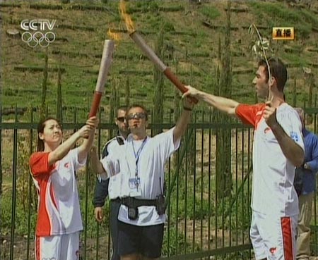 中新網(wǎng)3月24日電 北京奧運(yùn)圣火在希臘成功采集,火炬?zhèn)鬟f開始進(jìn)行。希臘境內(nèi)參與火炬?zhèn)鬟f的、來自奧運(yùn)東道國中國的羅雪娟從火炬手亞歷山大•尼克拉澤斯手中接過火炬,成為奧運(yùn)火炬接力的首位華人。