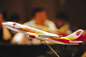 昨天,奧運專機模型首次亮相。從整體看,專機“身”著紅黃相間的外衣;從局部看,機身前面的一側畫著兩個火炬手高舉熊熊燃燒的奧運圣火的圖案,下面是“北京2008”和奧運會五環(huán)的標志。
