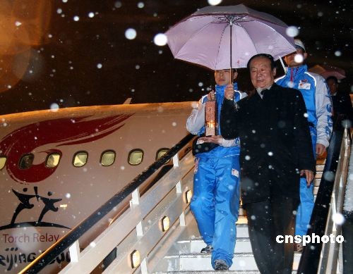 巴黎時間六日晚十一時四十五分(北京時間七日凌晨五時四十五分),北京奧運圣火傳遞“和諧之旅”抵達(dá)第五站“浪漫之都”法國巴黎,中國駐法大使孔泉和法國體育官員到瑞雪紛飛的機場迎接。圖為北京奧組委副主席蔣效愚等護(hù)送北京奧運圣火走下專機。