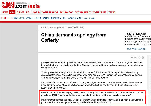 在CNN網(wǎng)站首頁中部的“Popular News”欄目中,刊登了《China demands apology from Cafferty(中國要求卡弗蒂道歉)》一文。文章前三段陳述了中國外交部對卡弗蒂言論的指責及要求卡弗蒂道歉的情況,在第四段中這樣說:CNN發(fā)表了一份聲明稱:“不論是卡弗蒂先生本人,還是CNN,都無意冒犯中國民眾;在這里,我們愿向受到此言論影響的人們道歉!