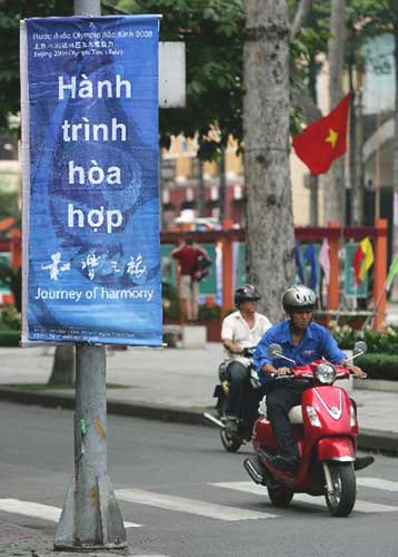 盡管北京奧運(yùn)圣火還未抵達(dá),但胡志明市為了迎接圣火的到來(lái)做好了各種準(zhǔn)備。在胡志明市街頭,處處可見(jiàn)懸掛著宣傳北京奧運(yùn)圣火傳遞活動(dòng)的彩旗。