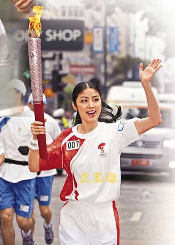 汪明荃昨日盛裝打扮出任火炬手,沿途不斷和市民打招呼。阿姐事后表示,心情興奮。她會將火炬放在辦公室,她亦表示會把火炬帶去供天水圍的小朋友拍照,因為在她跑的行程中,聽到好多小朋友大叫:“加油!中國加油!”( 植毅儀、李慶全、黃國強(qiáng))