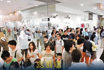 發(fā)言人說,今年黃金周適逢北京奧運火炬在港傳送,北京奧運熱潮席卷全港,火炬?zhèn)魉彤斕,商場人流大增。她說,旅客主攻名牌手袋、手表和化妝品,預期該商場的生意額較去年同期上升10%至15%。
