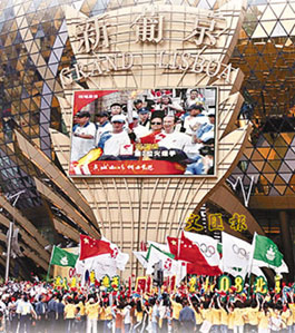 何鴻燊在首名火炬手手中接過火炬后,即在圣火護(hù)衛(wèi)隊(duì)簇?fù)硐虏角,有?jié)奏地跑起來,而大批記者均撲前拍照,鎂光燈閃個(gè)不停,兩旁市民不斷歡呼,令何鴻燊精神抖擻地完成了200米的傳遞路程,將火炬交到第3名火炬手手上。