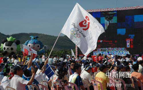 今天的三亞的天空格外晴朗,起跑儀式在鳳凰島“火鳳凰”廣場舉行,取“鳳鳴和諧”之寓意,在圣火傳遞起跑儀式現(xiàn)場,還鑲嵌了本站傳遞208位火炬手的手模。在一個簡短的儀式之后,北京奧組委副主席劉敬民點燃“祥云”火炬,海南省委書記衛(wèi)留成將火炬交給了第一棒火炬手、奧運冠軍楊揚。