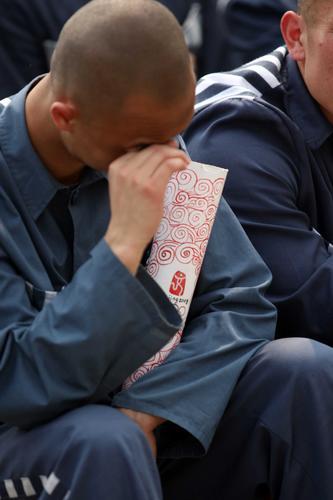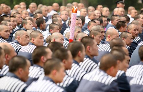 2008年5月6日,北京某監(jiān)獄,由服刑人員自制的祥云火炬在各監(jiān)區(qū)傳遞!皣鴥(nèi)火炬?zhèn)鬟f儀式”上,當(dāng)圣火經(jīng)過地圖上的家鄉(xiāng)時(shí),親切的旋律及關(guān)于家鄉(xiāng)風(fēng)土人情的介紹旋即傳到在場每位服刑人員耳畔,不少人流下思鄉(xiāng)悔過的淚水。