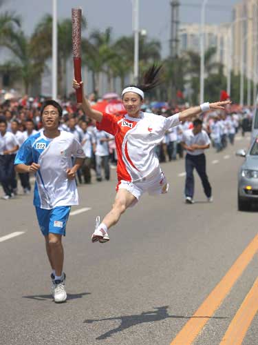 中新網(wǎng)5月11日電 奧運圣火另類的傳遞方式在國內(nèi)已不稀奇—早在5月6日海南省?谡镜膫鬟f中,火炬手凌萍就已經(jīng)讓所有人大開了眼界。