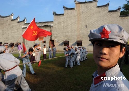 五月十四日,奧運圣火傳遞在江西瑞金站起跑,在中華蘇維埃共和國中央政府舊址人們穿著紅軍服裝展示當年“蘇區(qū)”體育活動。     中新社發(fā) 廖攀 攝