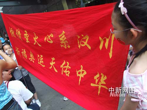 記者看到,人們在迎接奧運圣火的過程中,表達(dá)著自己對四川地震災(zāi)區(qū)人民的關(guān)心與支持。沿線到處是充滿溫情的橫幅,"與災(zāi)區(qū)人民攜手"、"圣火傳遞溫暖、奧運凝聚關(guān)愛" 。沿途的市民更是情緒高昂,"奧運加油","四川加油"的吶喊聲響徹西子湖畔。
