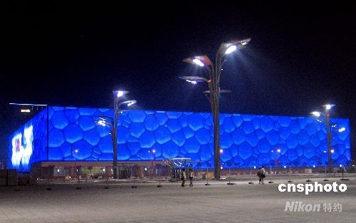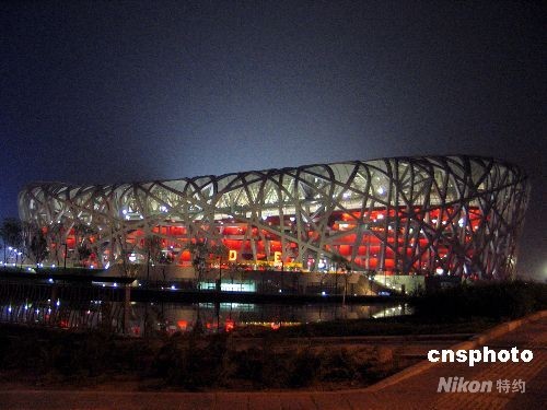 2008年5月22日,“好運(yùn)北京2008搜狐中國田徑公開賽”在國家體育場開賽,首日比賽持續(xù)到當(dāng)晚23:30結(jié)束。夜幕下的“鳥巢”和“水立方”在璀璨的燈光中更加壯麗紛呈,美輪美奐。     中新社發(fā) 張侃 攝