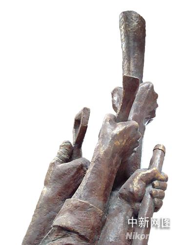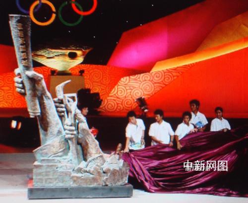 中新網北京6月2日電 (記者 賴海隆)5月31日晚,一尊名為“高擎圣火,克難興邦”的“5.12”大型紀念雕塑出現(xiàn)在“2008奧運景觀雕塑方案征集大賽頒獎活動”現(xiàn)場。專程從重災區(qū)趕來的十余名北川中學的幸存者與作者一起共同為此尊雕塑揭幕。這一象征中國人表達自強不息,重建家園,辦好奧運決心的一幕,將現(xiàn)場氣氛推向了高潮。