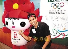 李致和站在京奧吉祥物“歡歡”身旁為自己打氣。 文匯報記者潘志南 攝