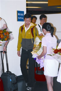 圖:隊(duì)長(zhǎng)馮坤接受歡迎花束。(圖片來源:澳門日?qǐng)?bào))