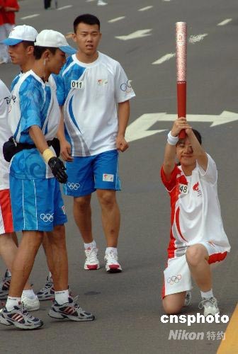 圖:殘疾人火炬手赤峰跪迎奧運火炬