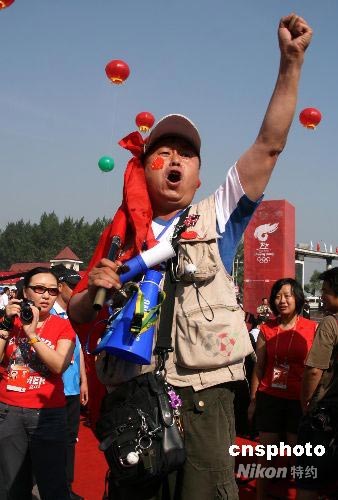7月11日,北京奧運(yùn)火炬在哈爾濱傳遞。在起跑儀式現(xiàn)場(chǎng),被稱為“哈爾濱第一球迷”的老崔,指揮當(dāng)?shù)孛癖姙閵W運(yùn)火炬?zhèn)鬟f吶喊助威。 中新社發(fā) 周兆軍 攝