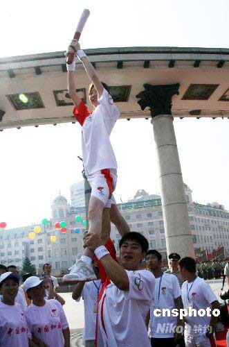 7月11日,“冰上搭檔”、花樣滑冰世界冠軍張丹、張昊在哈爾濱傳遞奧運火炬,張昊托起張丹用高難動作傳遞火炬。