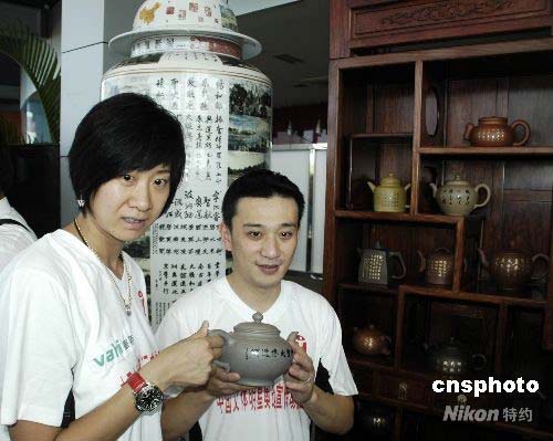7月12日,“2008奧林匹克文化中國行”在海南三亞開幕。作為全國巡展的首站,三亞的展覽活動歷時兩天,公開展示由226名書畫家共同創(chuàng)作的奧運(yùn)主題大型書畫作品《神州圣火傳遞圖》和《神州圣火傳遞頌》。作品全面描繪了113個火炬?zhèn)鬟f城市的風(fēng)土人情;顒悠陂g還展出奧運(yùn)文化優(yōu)秀作品“中華紫砂壺”和“盛世將軍瓶”。圖為1996年亞特蘭大奧運(yùn)會游泳冠軍樂靜宜(左)和2000年悉尼奧運(yùn)會跳水冠軍肖海亮(右),在“中華紫砂壺”和“盛世將軍瓶”前展示“中華紫砂壺”。中新社發(fā) 尹海明 攝
