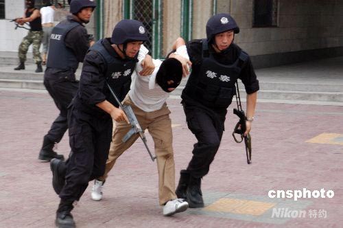 7月14日,安徽省亳州市警方舉行“2008利劍行動”奧運安保反恐演練,公安、武警、消防各警種密切配合,上百名特警隊員進行了解救人質(zhì)等課目的實戰(zhàn)演練,充分顯示了已全面做好奧運防范和處置各類恐怖襲擊事件的準(zhǔn)備。圖為安徽亳州警方特警隊員在反恐演練中。 中新社發(fā) 張延林 攝